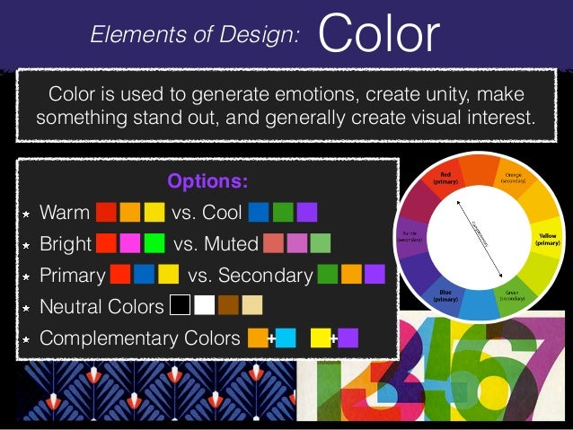 Elements Of Design Color, How To Apply Colour Elements Of Design : Saturationrefers to the intensity or purity of the color.. Much like different styles and types of line can effect the mood of a piece of art work, color also has this ability. When used correctly, negative space plays a pivotal role in the success of your design. It can also convey a mood. Most brands establish a design system—or a collection of reusable functional elements, components, and colors—to make this process easier. Therefore, when a shape or element is incomplete, the white space can help your reader unconsciously fill the gaps.